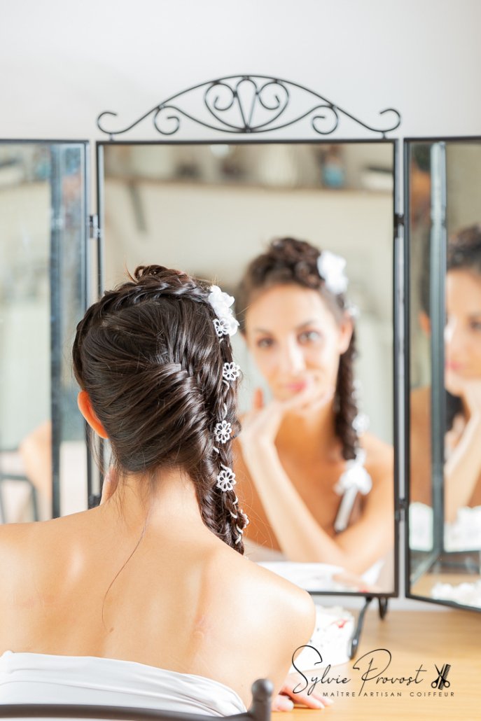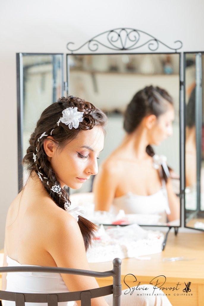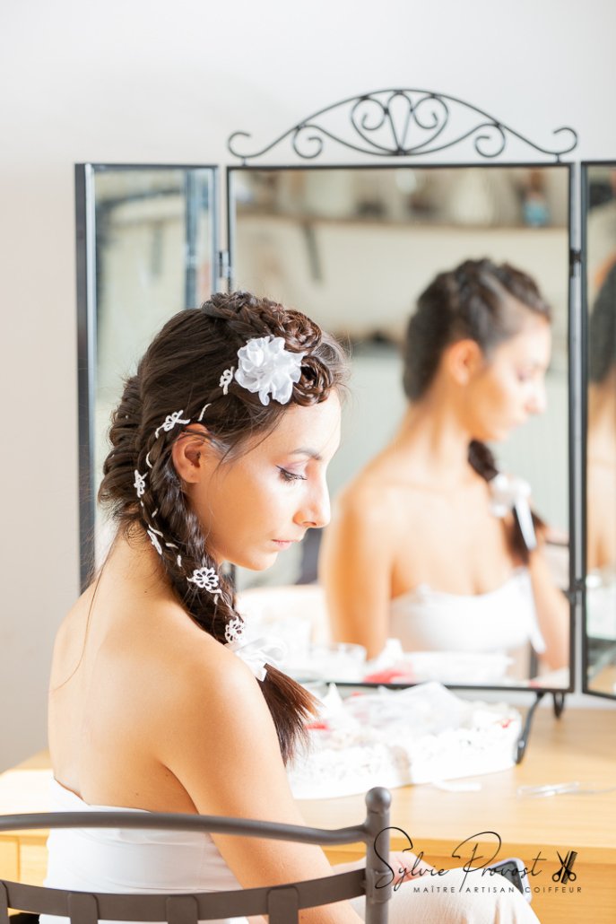 Voici un essai de coiffure de mariée, sur base de tresse un peu dans le style Bohème, avec utilisation d’un accessoire tressé dans les cheveux, de ma confection et réalisé au crochet.