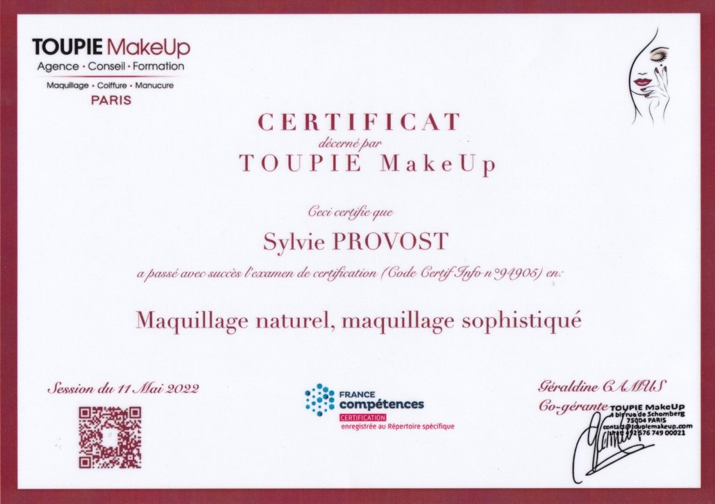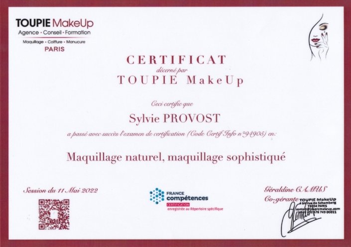 - Certification professionnelle maquillage naturel / maquillage sophistiqué (Toupie Makeup)