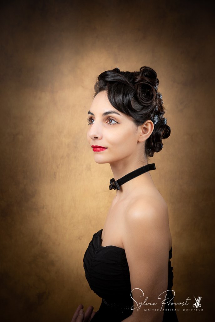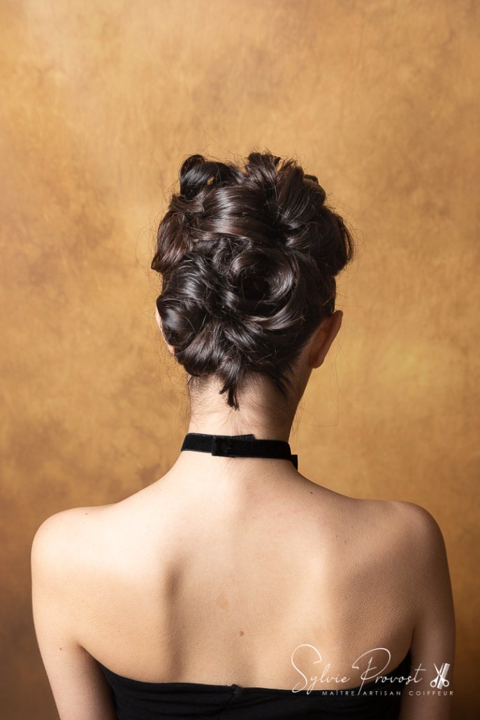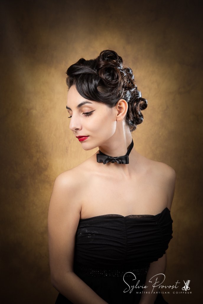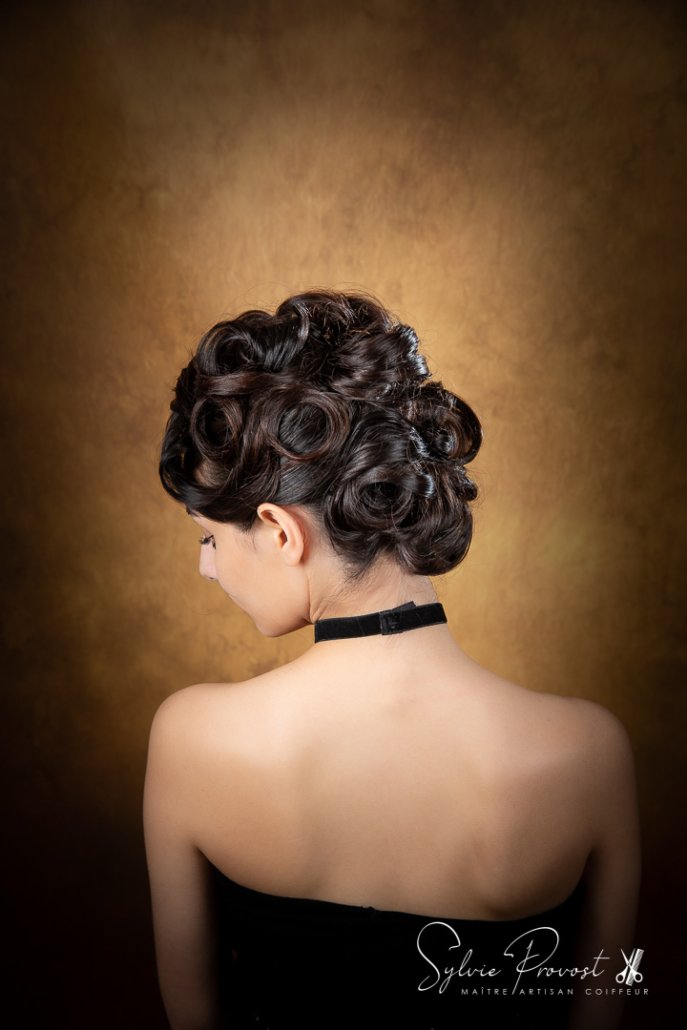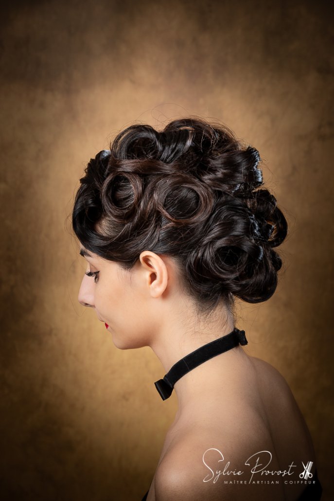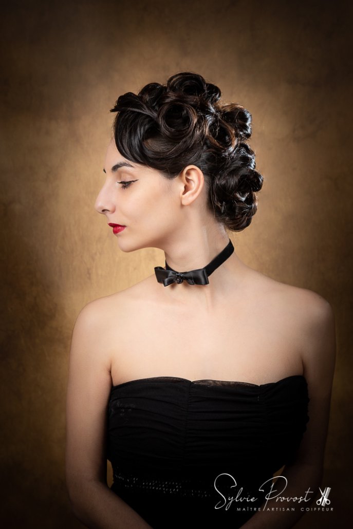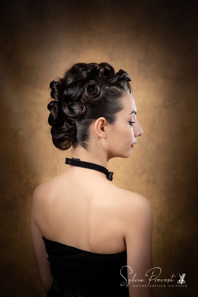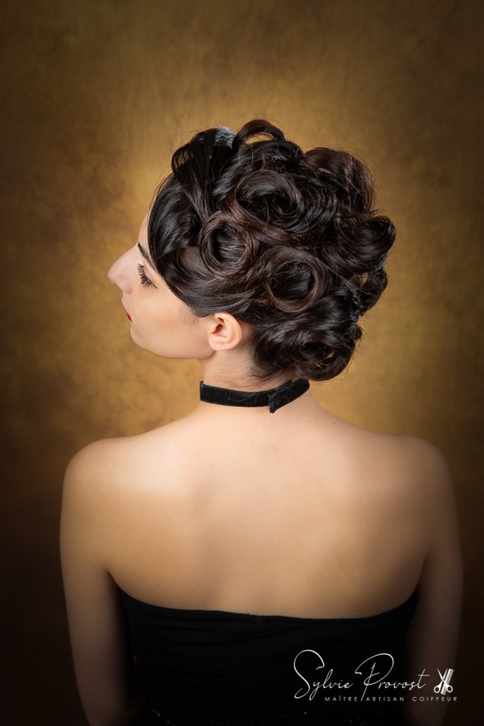 Cela faisait un moment que je désirais mettre en avant ce type de coiffure, qu’il n’est pas courant de réaliser et qui peut autant s’adapter en coiffure de mariée, qu’en chignon de soirée. Le chignon bouclé allie l’élégance au côté vintage, lorsqu’associé aux accessoires comme le tour de cou (fabriqué par mes soins), qui apporte cette petite touche nécessaire pour asseoir le côté classique de la coiffure.