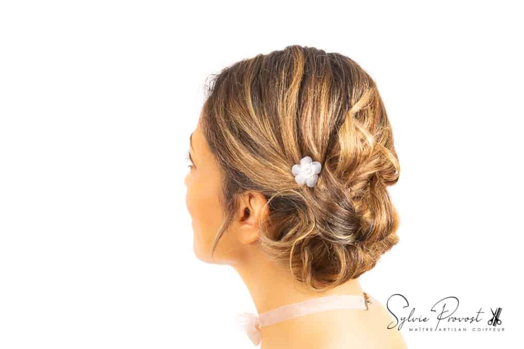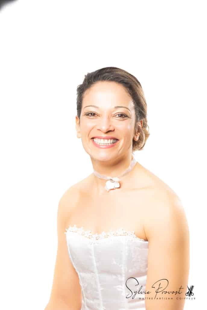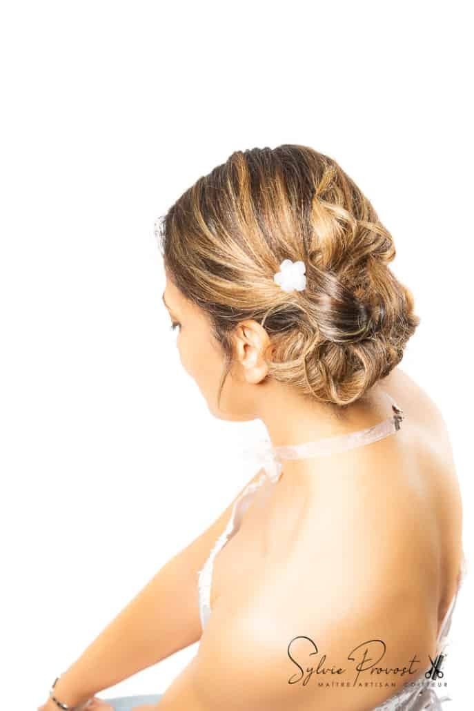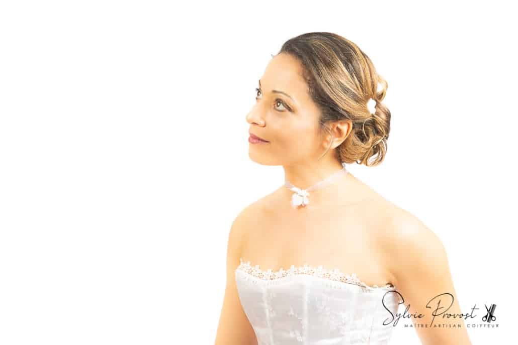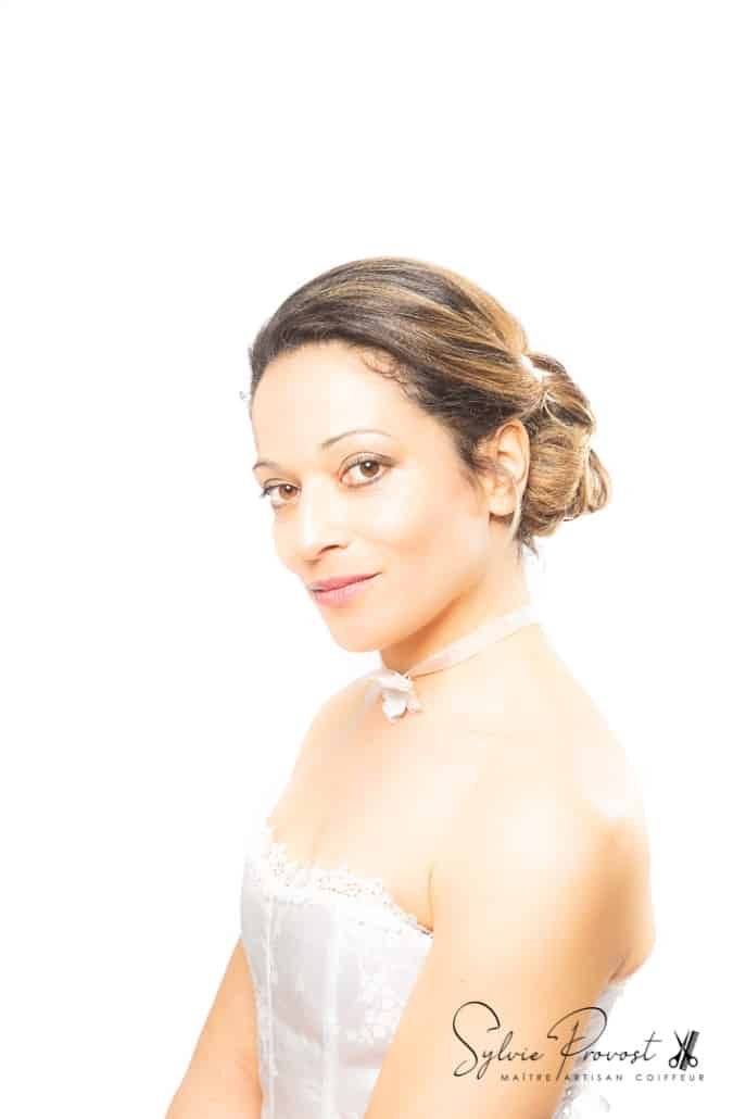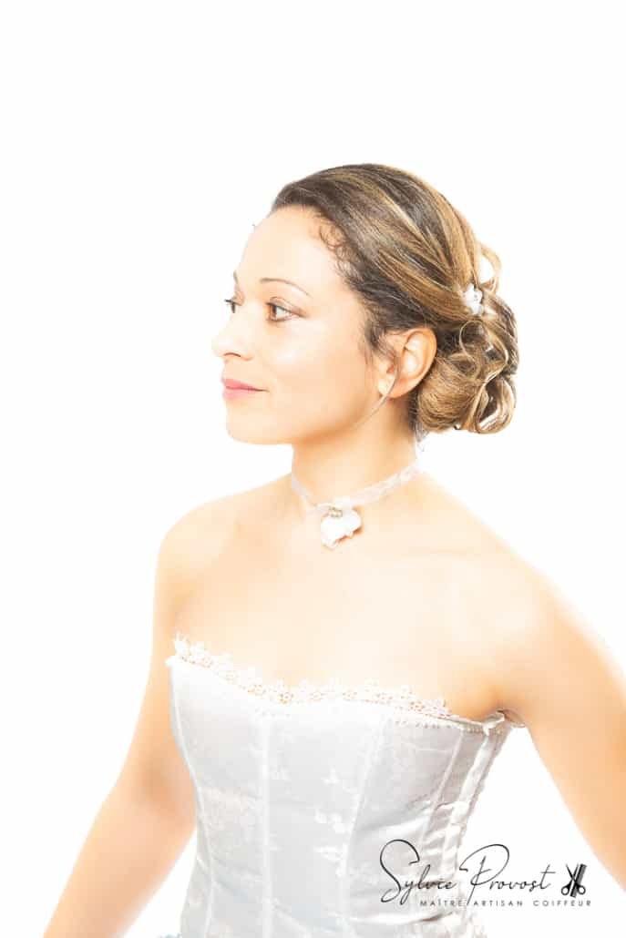 Shooting « Belle & ReBelle » réalisé sur la thématique Chignon bas classique en mode mariée, avec notre modèle Eve, qui s’est prêtée au jeu. La coiffure a nécessité un lissage des cheveux naturellement bouclés de notre modèle. Le chignon bas, couplé à une robe sobre épaules dégagées et des accessoires discrets (dont le tour de cou) réalisés par mes soins, rend un joli résultat, dans le plus pur style classique de coiffure de mariage.